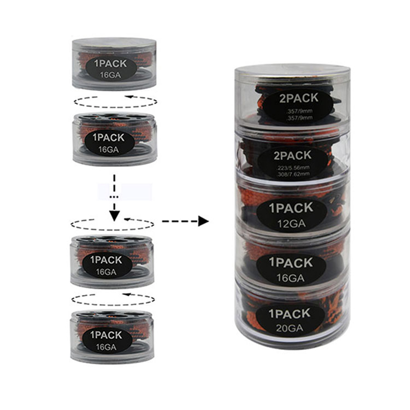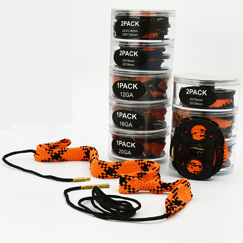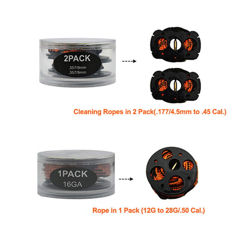● Silah təmizləyici iplər sıx tikilir, asan olmayacaq; Quraşdırılmış fırça ilə sitetik lif ipi sürətli və təsirli olanı təmizləyə bilər. Caliber nömrəsi hər bir son qozunda lazer çap olunur. Roplar təkrar istifadə üçün yuyulur.