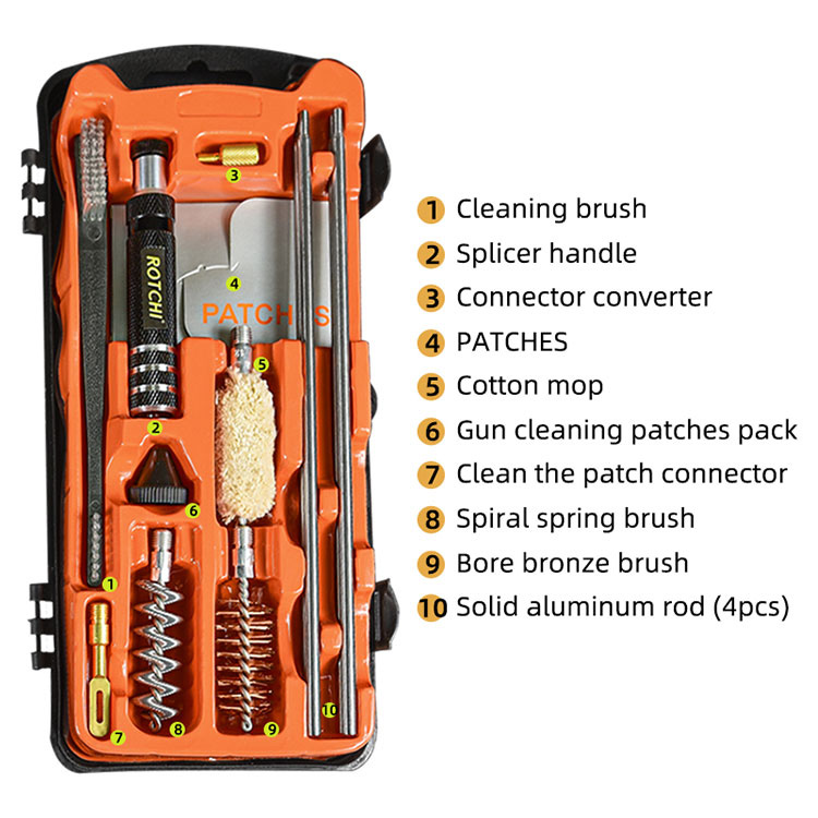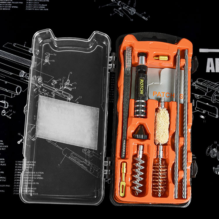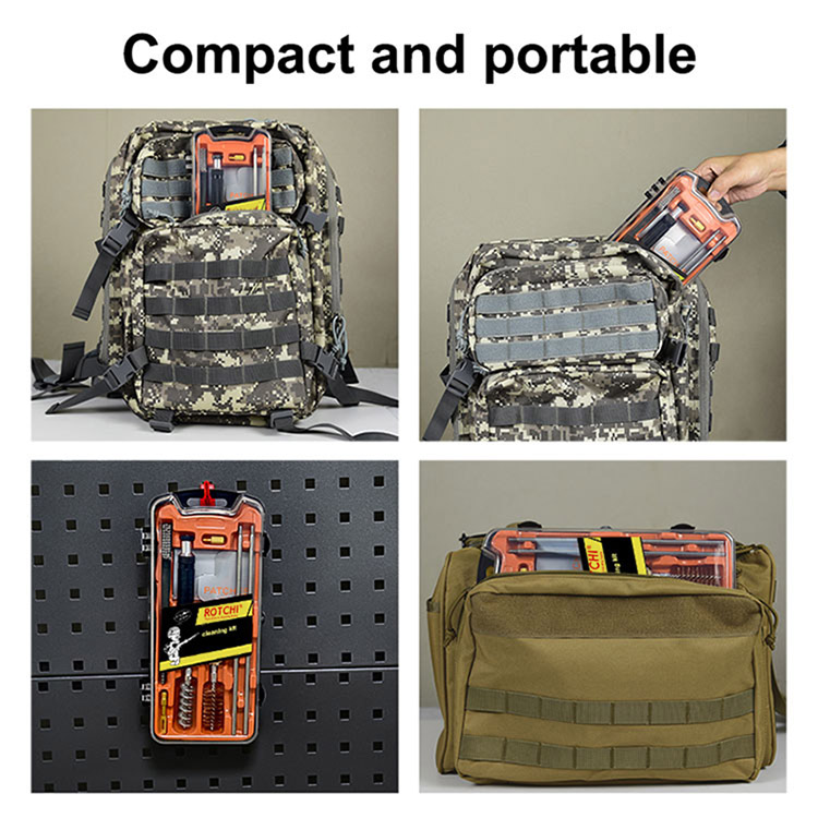 Silah təmizləmə dəsti ov tüfəngi dəsti müxtəlif silah çaplarına cavab vermək üçün sizə tam peşəkar təmizləmə alətləri təqdim edir. Blister qablar onları müntəzəm olaraq toplamağa kömək edir. Kiçik həcm və güclü qutu onları silah qutularına və ya çuval çantalarına qoymağa imkan verə bilər. Serial yağ şüşəsi olmadandır.