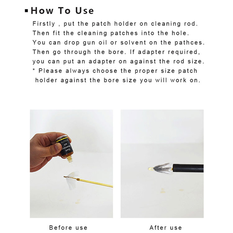 ● 4 Ölçülər Slotted Silah Təmizləmə Patch sahibləri / tövsiyələri .177Cal-dan olan kalibrlərlə cavab verə bilər. / 4.5mm-dən 12 ölçü, tüfəng, ov tüfəngləri, ov tüfəngləri üçün uyğunlaşdırıla bilər.