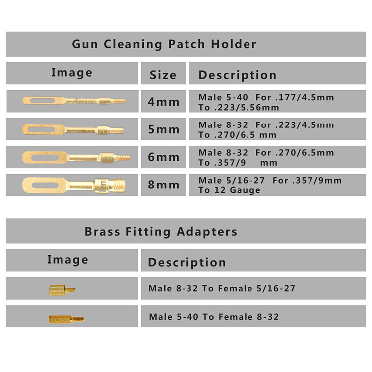 ● 2 uyğun adapterlər, lazım olduqda təmizləyici çubuğun üzərində birləşdirməyə kömək edə bilər. Kişilərə 5-40 qadın 8-32; Qadın 5 / 16-27-dən 8-32 kişi bazarda ən populyar çubuq adapterləridir.
