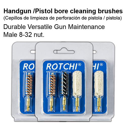 Tapanca deşikli təmizləmə fırçası 3-ü 1-də dəst, blister və kart paket. Mövcud ölçülər: .22, 9mm, .40, .45kal.
