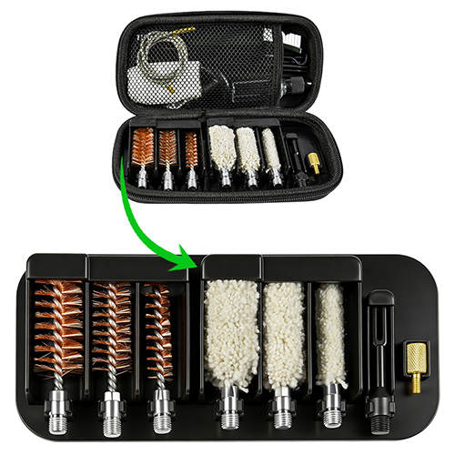 Ov tüfəngi təmizləmə dəstinə 3 ölçü daxildir (12/16G, 20G, 410). Pirinç fırçalar və pambıq mop, 4 çubuq 1 kalbe. Seçimlər üçün qum və qara rəng.